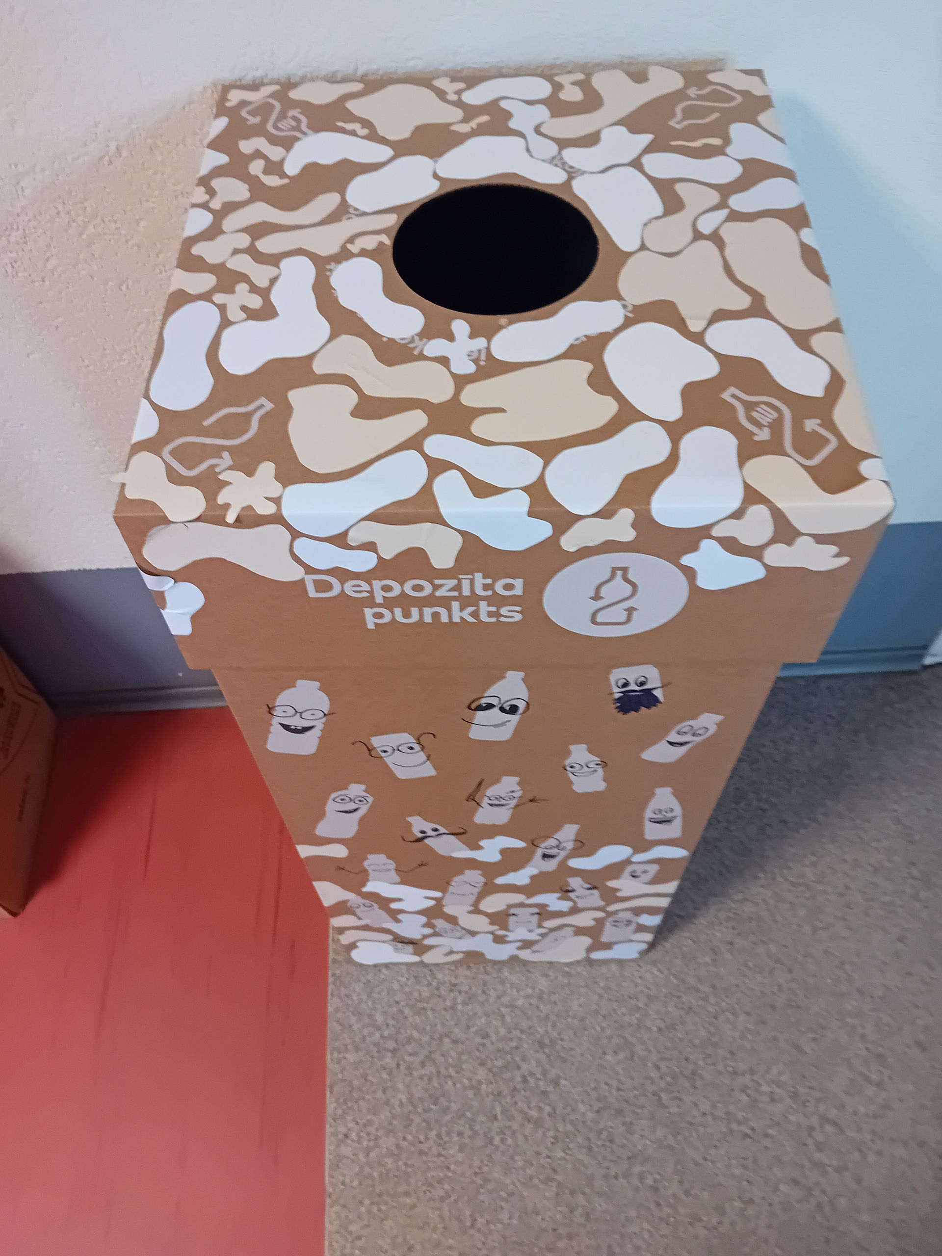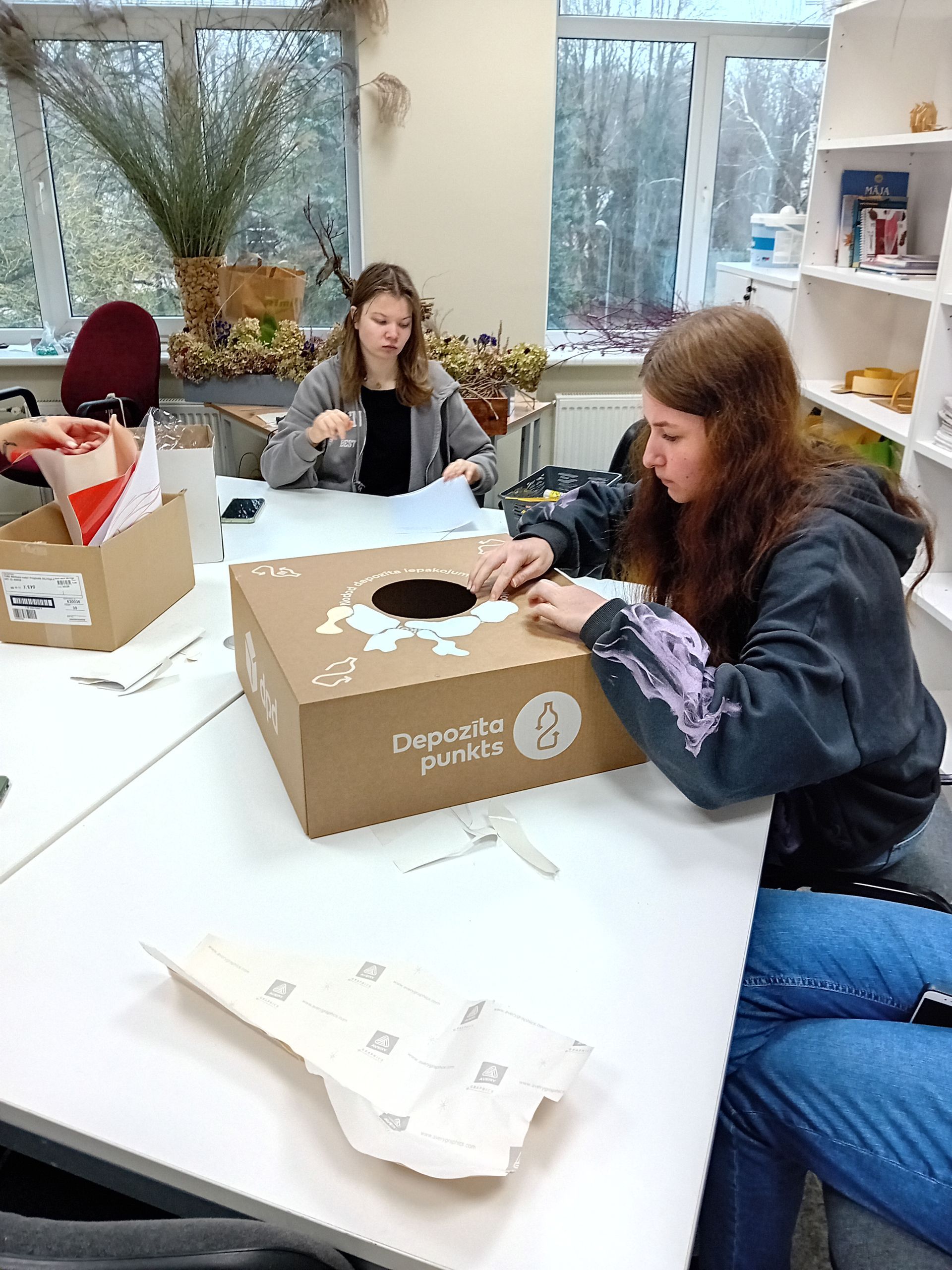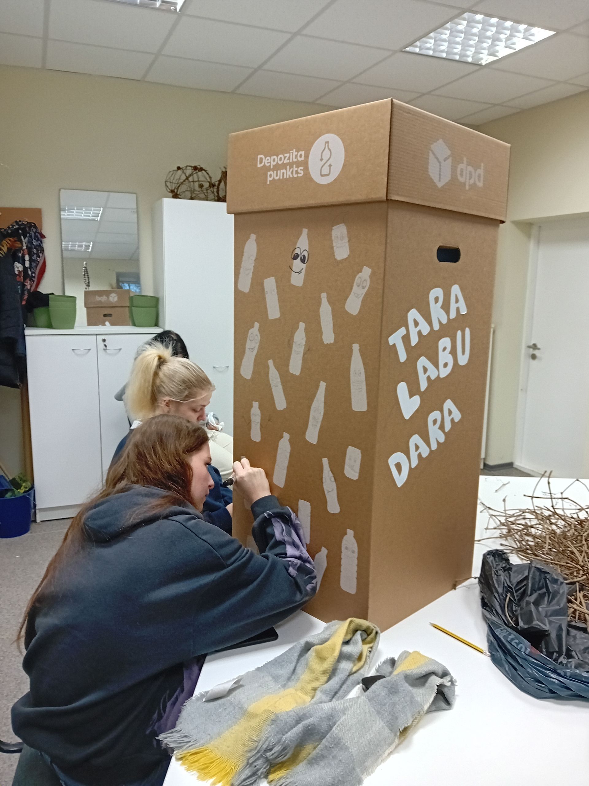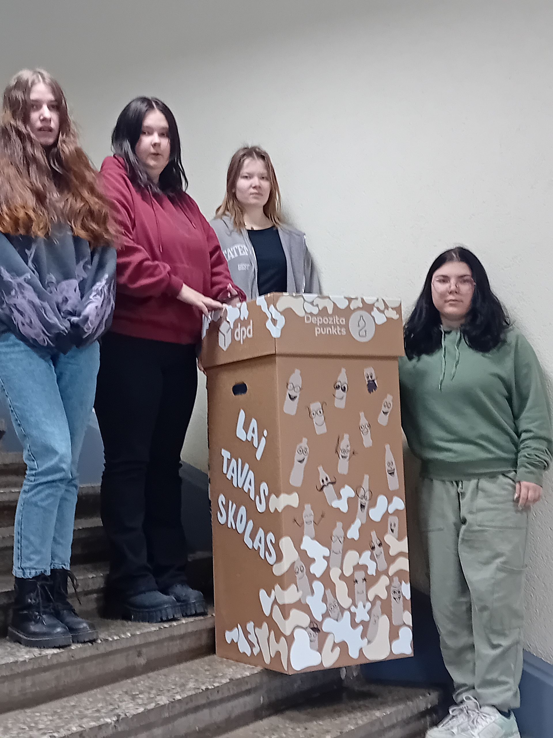 Kandavas Lauksaimniecības tehnikuma Saulaines struktūrvienības 4. kurasa audzēknes Viesmīlības pakalpojumum specialitātē mācību priekšmeta "Telpu dizains un floristika" ietvaros izveidoja patstāvīgu kopdarbu ar devīzi "Pastāvēs, kas pārvērtīsies." Šis Raiņa citāts atspoguļo darba ideju -depozīta pudeles un dzērienu bundžiņas priecājas, ka tiek pārvērstas jaunā izejvielā, no kuras var atkal pagatavot noderīgas lietas. Darbu veidojām, izmantojot līmplēves atgriezumus un melnos marķierus. Saglabājām neitrālos toņus un uz kastes esošos apzīmējumus, lai būtu skaidrs tās izmantošanas mērķis. Atradām vietu kastes novietošanai tuvu kāpnēm un audzēkņu atpūtas zonai. Depozīta maksu izlietosim dizaina materiāliem, kurus izmantosim savos radošajos darbos skolas interjera papildināšanai.Darba veidošanā piedalījās:Santa Sergejenkova ,Jūlija Semjonova,Viktorija Poļakova,Liāna Tiltiņa,Melisa Zemtaute,Nikoleta Ņikiforova. Audzēknes konsultēja skolotāja Aija Ušerovska.
