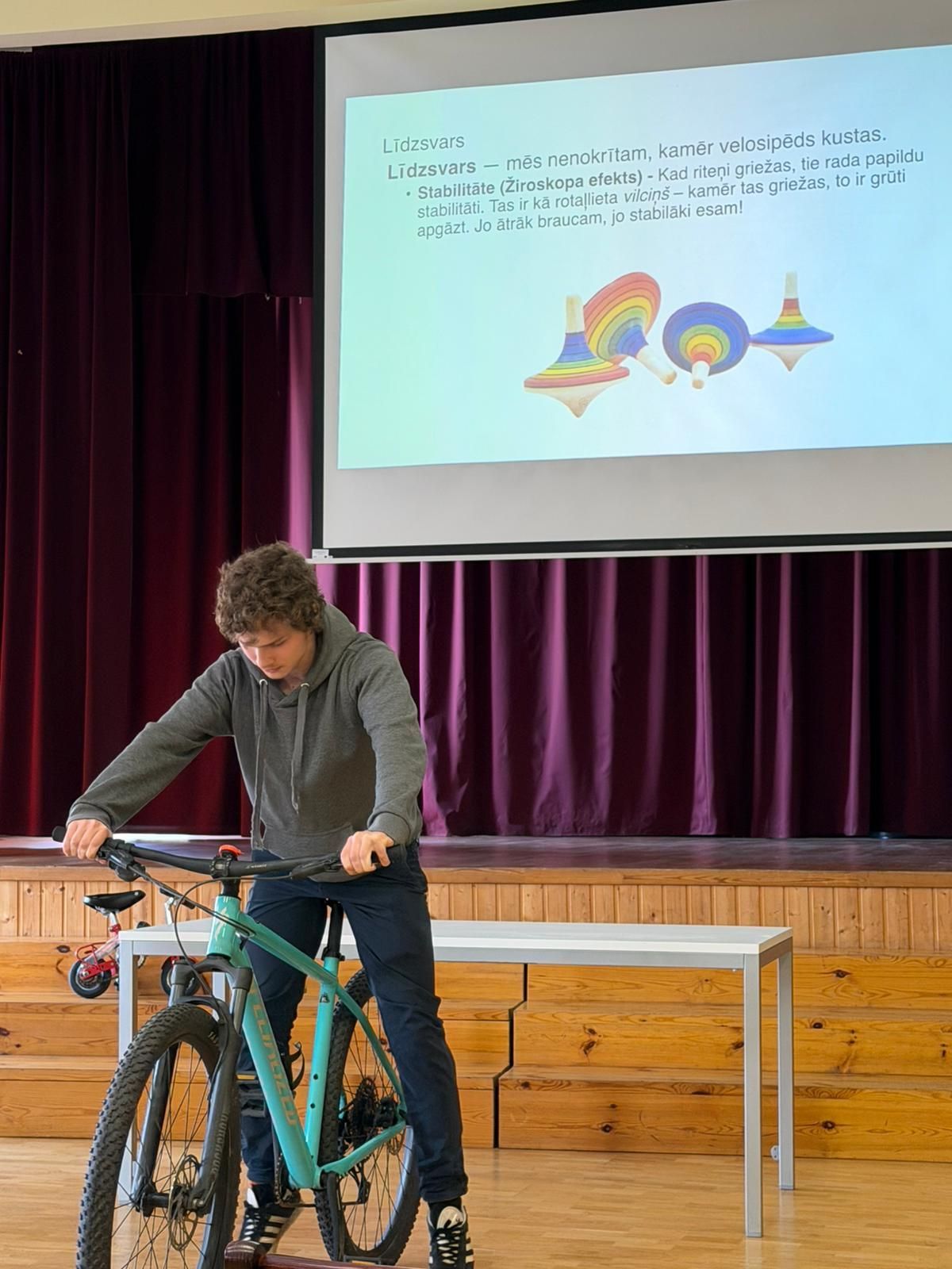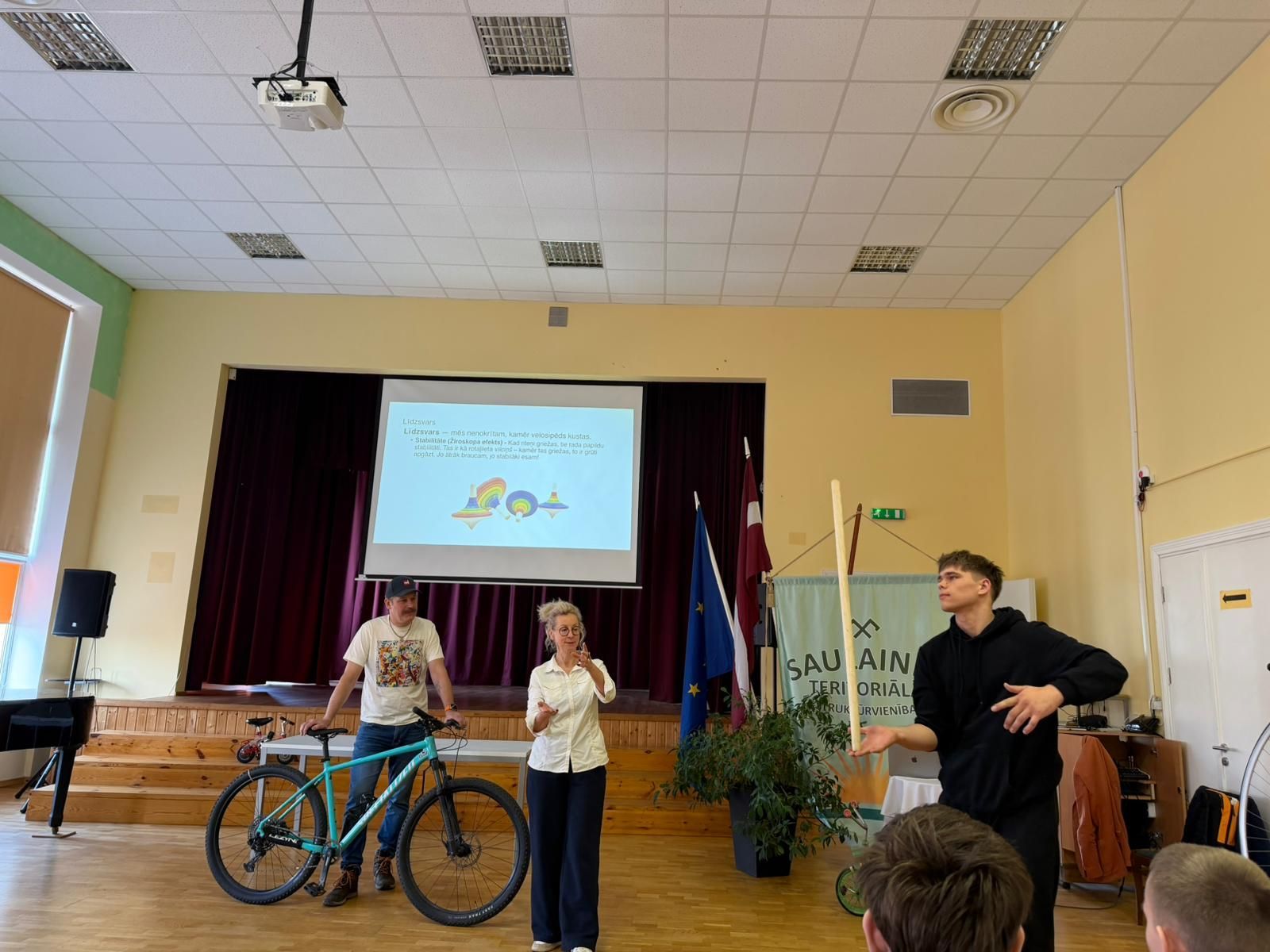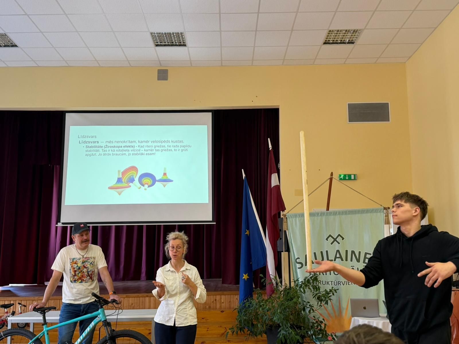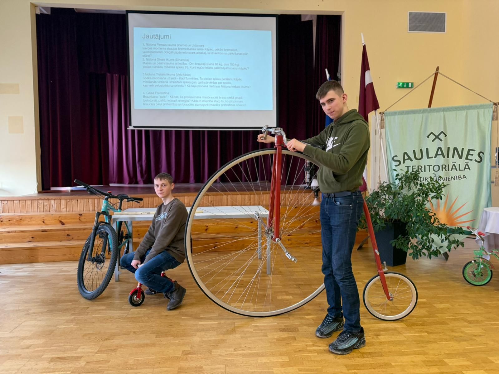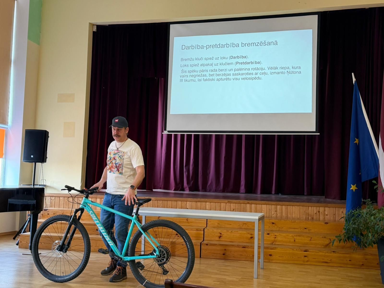Fizikas nodarbībā audzēkņi praktiski pētīja Ņūtona kustības likumus, izmantojot velosipēdus un veicot dažādus eksperimentus.