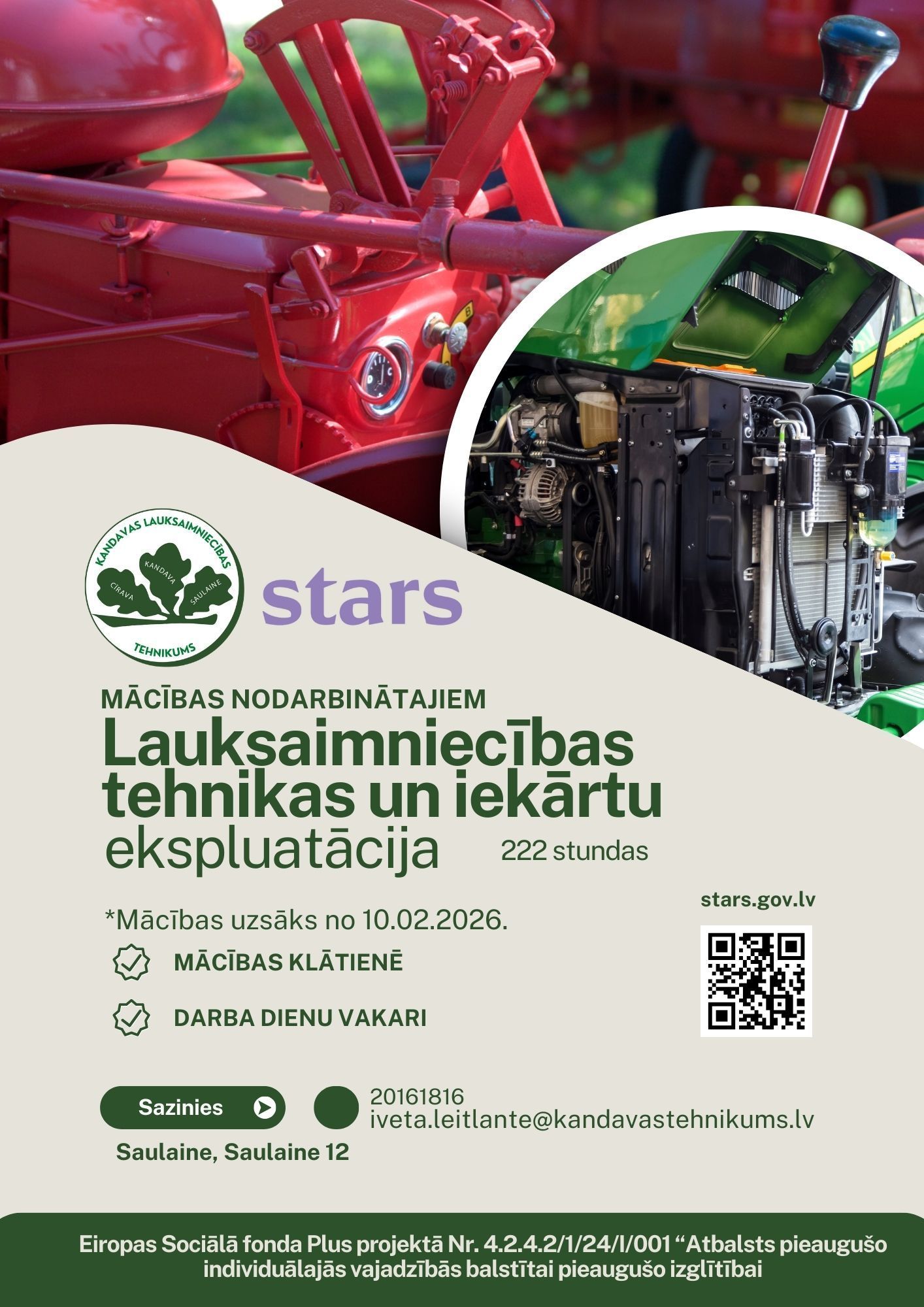 - Lauksaimniecības tehnikas un iekārtu ekspluatācija – zināšanas darbam ar tehniku.