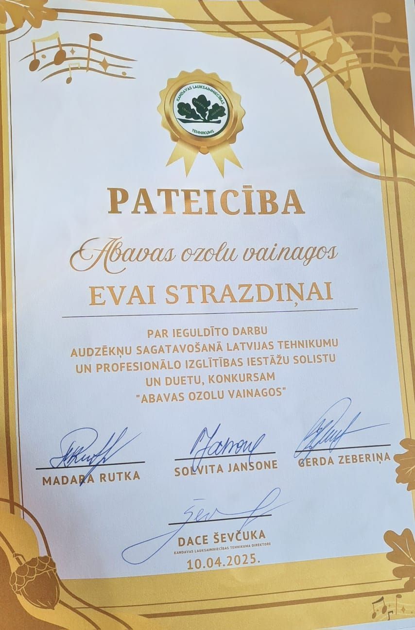 10. aprīlī Kandavas Lauksaimniecības tehnikums organizēja vokālo ansambļu konkursu , "Abavas ozolu vainagos", kur piedalījās dalībnieki no dažādiem tehnikumiem un profesionālajām vidusskolām. Mūsu struktūrvienību pārstāvēja, Laura Nolberga un Dāvids Bērziņš, kuri skolotājas, Evas Strazdiņas vadībā bija sagatavojuši dziesmu, "Mani sapņi" /Daigas Rūtenbergas mūzika un Ingas Aizkalnietes vārdi/. Jaunieši ieguva pirmās pakāpes diplomu, kas ir augsts novērtējums un bija gandarīti par paveikto. Paldies par ieguldīto darbu!